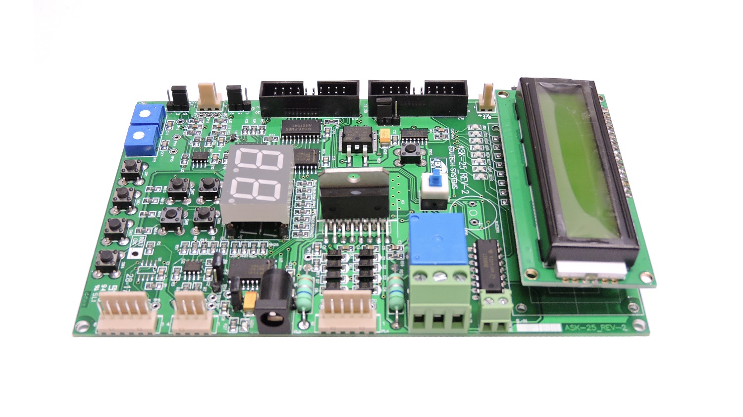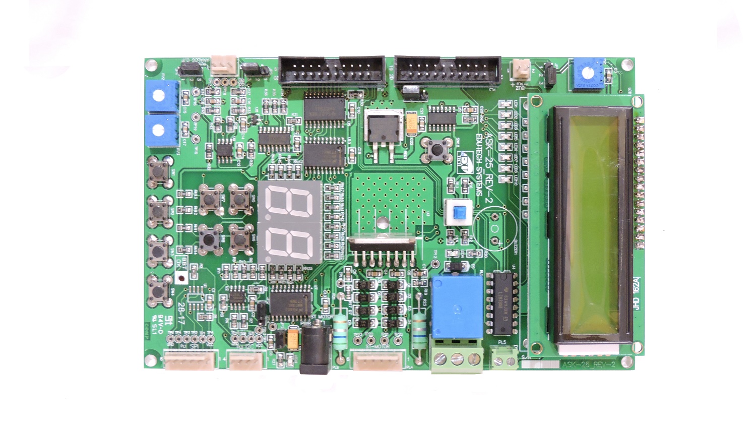 - On board display options includes 8 LED, 16x2 character LCD, 2 digit 7-segment display