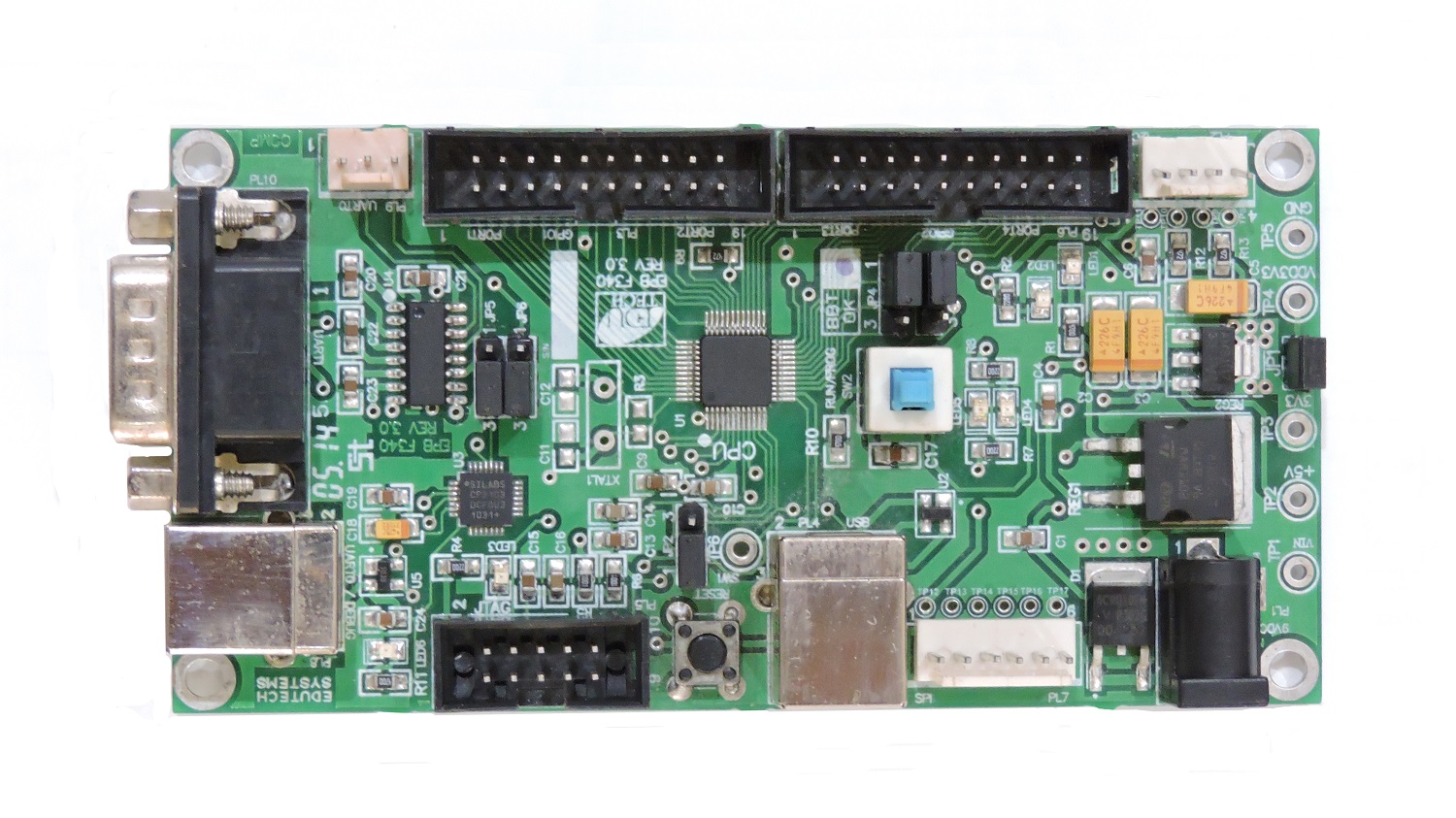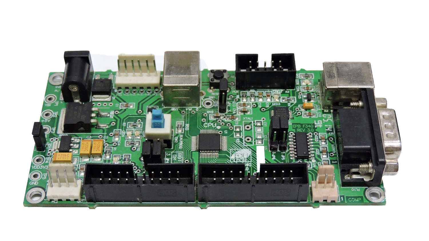 This Educational Practice Board features the C8051F340 CPU from Silicon Lab. This board is designed for the first time learners who are interested to get introduced to the micro controller programming. The board offers two flashing options - USB and JTAG. The controller offers rich features like 10 bit ADC, comparators, USB, JTAG, high speed (upto 48MHz) operation, four 16 bit timers, serial peripherals like UART, SPI, and I2C etc. This board can be interfaced with different interfacing boards and can be used to learn basic micro controller programming techniques.